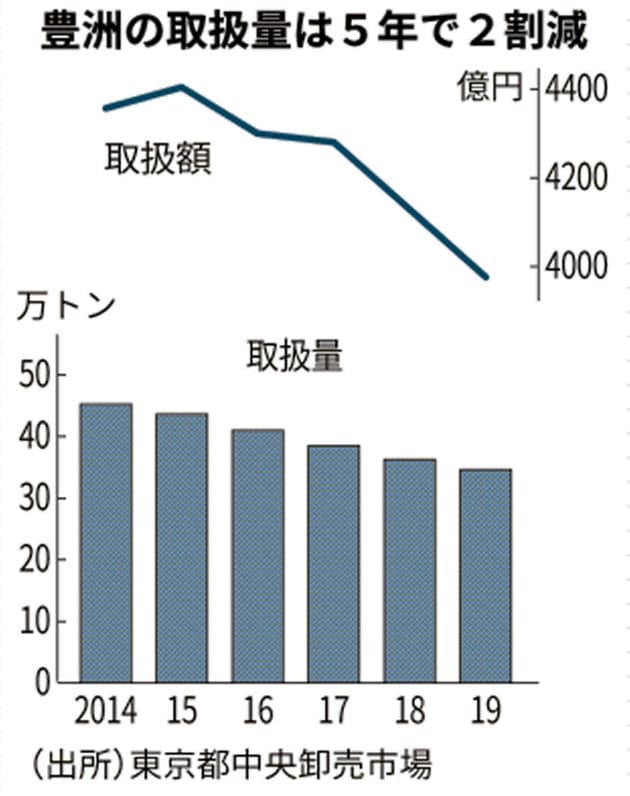 魚の消費が減り続けている。2019年の魚介類向け支出額は3年連続で過去最低を更新した。サケ、サンマやイカなど大衆魚が不漁で、価格上昇が消費者を遠ざけている。サーモンなど輸入水産物も、世界の需要増で国際相場は右上がりだ。豊洲市場(東京・江東)の19年の取扱高は前年より約5%減少。20年も新型コロナウイルスの感染拡大で取引は落ち込んでいる。