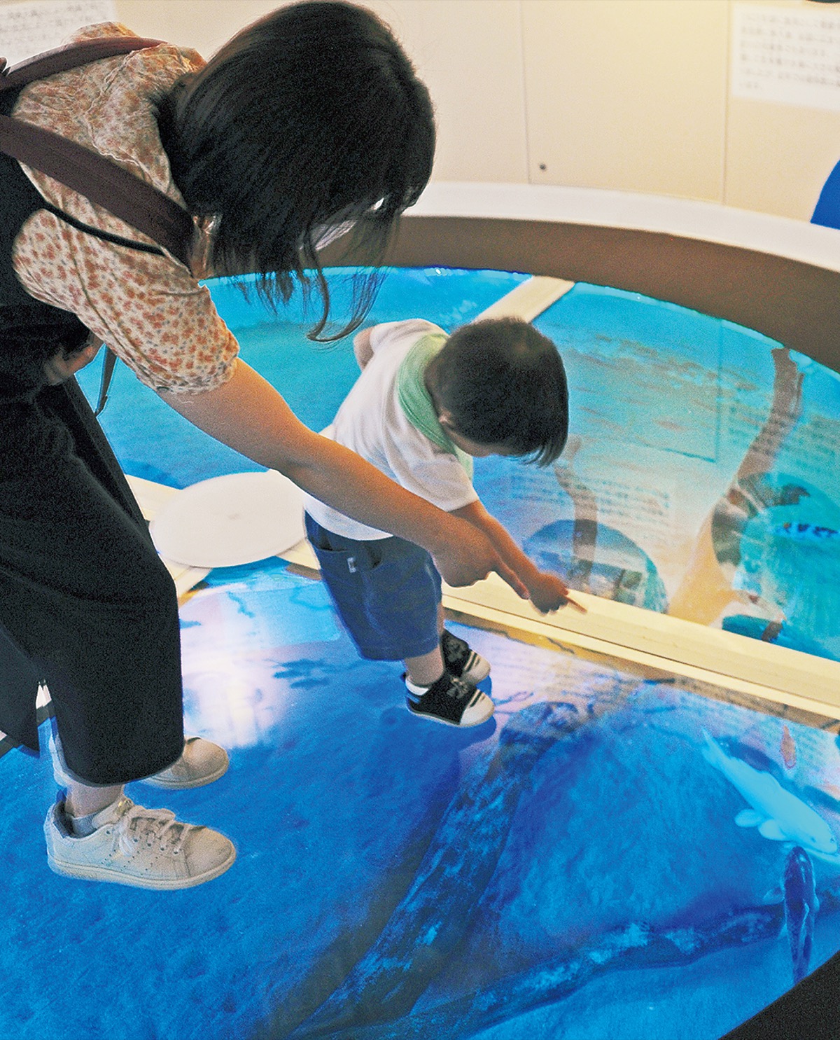 相模川の自然を楽しみながら学べる、相模川ふれあい科学館(水郷田名)にこのほど、新スポット「水上散歩水槽」が誕生した。相模川の水源をイメージして造られた水槽で、水の上を歩くように、生き物たちを上から観察できる。