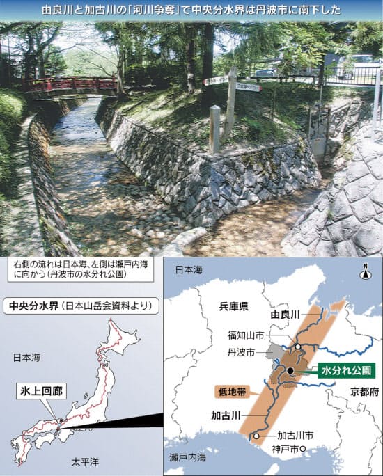 山から下ってきた高谷川の流れは水分(みわか)れ公園で分岐する。右の流れは由良川を経て日本海へ約70キロ、左の流れは加古川を経て瀬戸内海へ約70キロ。本州で最も低い中央分水界はさらに下流の石生(いそう)交差点付近にある。
