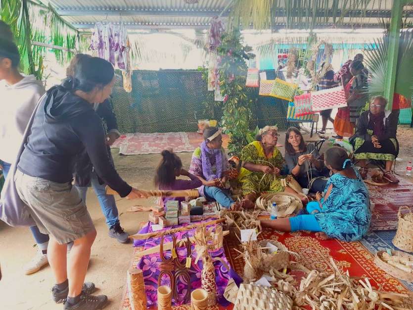 Les ateliers d'initiation au tressage de pandanus et de feuilles de cocotier, animés par le comité des femmes de Thio, en collaboration avec des associations de femmes de Canala, de Hienghène, de Lifou, d'Ouvéa et de Nouméa connaissent un vif succès. Photo Lorenza M'Boueri