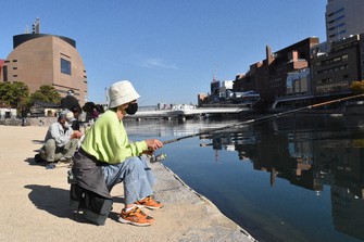 「紫川・市民ハゼ釣り大会」が15日、小倉北区の北九州市役所周辺で開かれた。好天に恵まれた中、170人が水面に糸を垂らして楽しんだ。