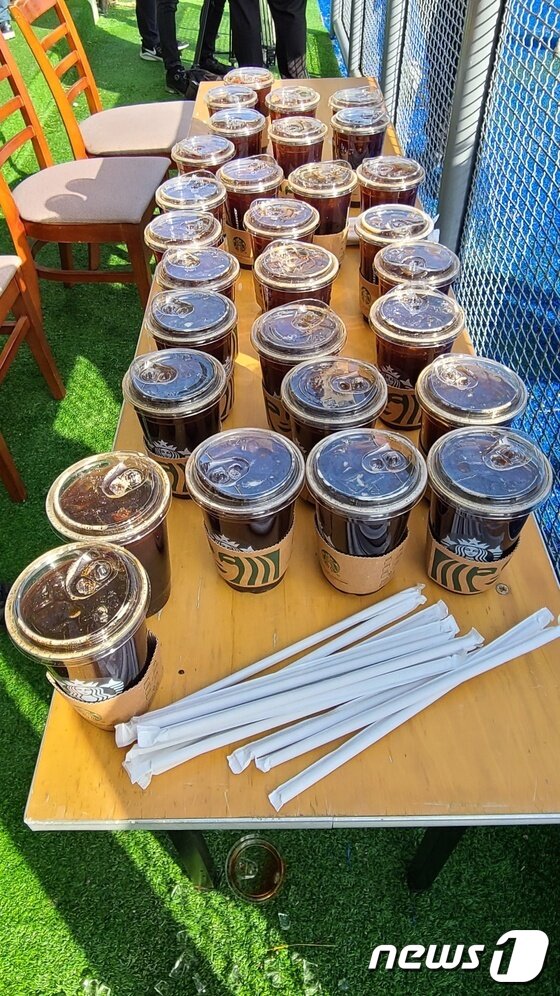 | 2일 서귀포 강창학야구장에 배달된 스타벅스 커피 100잔. © 뉴스1 |