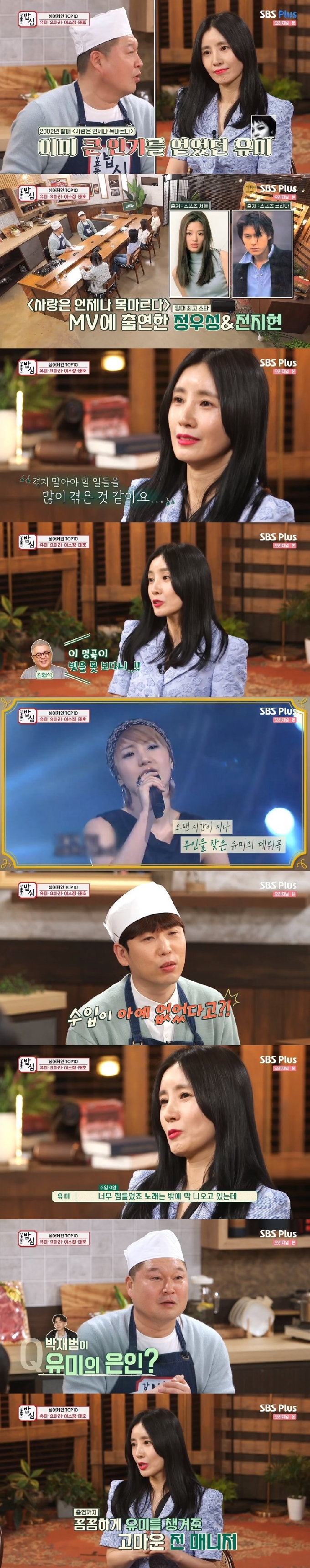 15일 오후 방송된 SBS Plus 예능 프로그램 '밥은 먹고 다니냐-강호동의 밥心'(이하 '강호동의 밥심')에는 JTBC '싱어게인' 톱10 출신 유미가 등장, 메가 히트곡 '사랑은 언제나 목마르다'에 대해 "수입이 0원이었다"라고 밝혀 놀라움을 줬다.