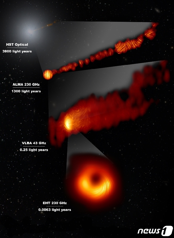 이어“M87 블랙홀 주변의 뜨거운 가스 일부는 가장자리의 강한 자기장의 압력으로 블랙홀 중심의 강한 중력에너지를 이기고 밖으로 밀려 멀리 제트의 형태로 날아간다”라며 “나머지 일부는 자기장에 끌려 사건의 지평선으로 나선운동하며 떨어진다”고 설명했다.